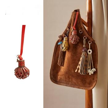सुरुचिपूर्ण बेडेड टासा बैग आकर्षण pu चमड़े की कॉर्ड के साथ बैग और सामान के लिए धातु की अंगूठी कीचेन पेंडेंट